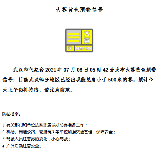 仙桃市气象台2021年07月06日05时54分发布大雾黄色预警信号:目前,仙桃市已出现能见度小于800米,局部小于200米的雾,预计今天上午仍将持续,请注意防范!