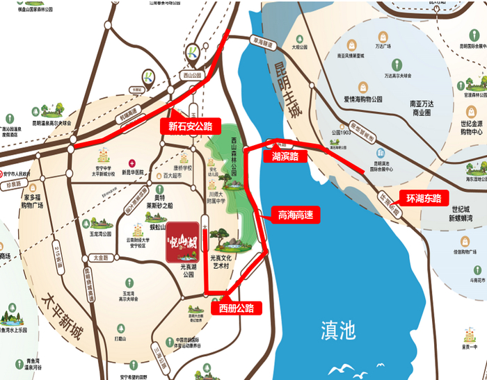 ● 背靠昆明著名的西山森林公园,距滇池湖岸15分钟车程;