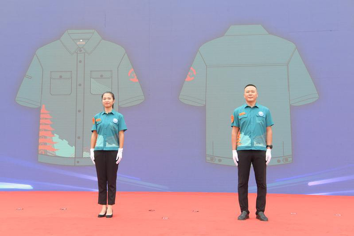 新服装提取了西安标志性的古迹大雁塔和城墙造型元素进行设计,主体为镂空的大雁塔塔体叠加发散线条,既有光芒照射在塔上的特色风景,同时增强了图案体积感。塔后的城墙做了流动型的过渡,由左至右的变化形成视觉延伸,与右侧渐变曲线做呼应,让整体画面更加丰富,更具有连贯性。考虑到驾驶员特殊的工作环境,新服装的面料着重考虑透气性和耐磨性,并在肩膀与安全带接触的部位做了加厚处理,让驾驶员穿着更加舒适和美观。