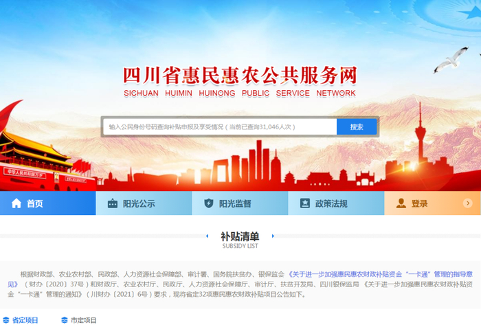 日前,四川省惠民惠农公共服务网公布惠民惠农财政补贴项目清单,清单详细描述了项目名称、主管部门、补贴对象、补贴标准、执行年限等相关信息。