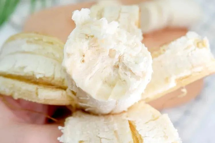 摸起来超嫩滑,就像在摸布丁,撕开它金黄色的外衣,就能看到奶白色的厚实果肉,轻轻掰开,淡淡的香蕉果香立马窜入你的鼻腔~