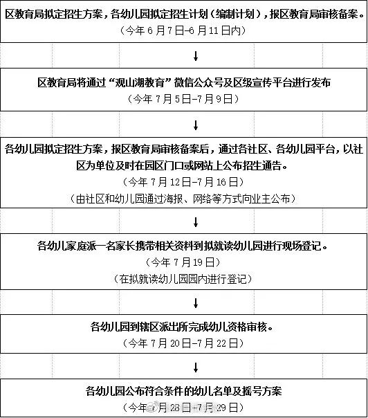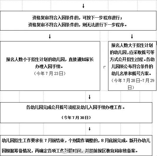 注:各幼儿园要向报名家长告知招生情况,并耐心细致地做好未被招收幼儿家长的解释工作。幼儿园招生工作要求在7月底前全面结束,个别需作调整的,报区教育局审核同意后,8月底前完成;新开办幼儿园根据筹备情况,确定各项工作开展时间,提前报区教育局审核备案。