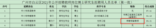 近日,广州市白云区教育局公布了一份2021年公开招聘教师岗位博士研究生拟聘用人员名单,其中一人因其拥有副教授职称而格外受到关注。