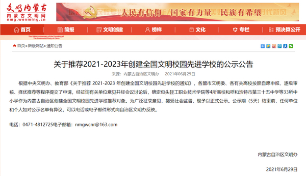 据了解,根据中央文明办、教育部《关于推荐2021-2023年创建全国文明校园先进学校的通知》,各盟市文明委、各有关高校按照自愿申报、逐级审核、择优推荐等程序提交了申请,经征询有关单位意见并经会议讨论后,确定内蒙古自治区创建全国文明校园先进学校推荐对象。