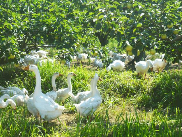 果园里放养鹅、鸭等,它们的粪便成了天然的农家肥,还会配合人工除草、物理防虫灯除虫。