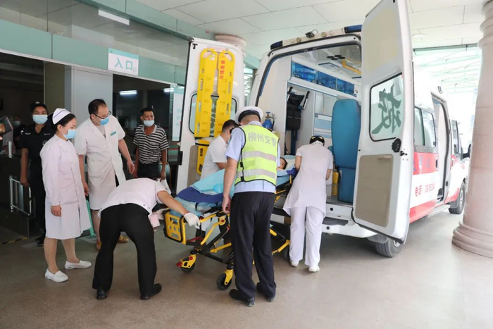 7月6日9时,担任护航任务的警车抵达工人医院西院,转院车辆在警车护卫下前往河池市第一人民医院。10点30分,车队抵达医院,双方的医护人员进行转院交接工作。11时,妥善安置好3名伤者后,3辆救护车向柳州市工人医院出发。