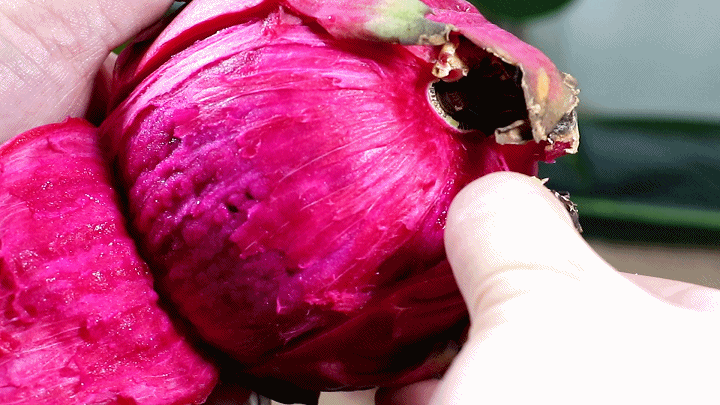 红心火龙果叶片薄且颜色相近,受到北纬18°的高温烤。水分自然流失造成皱皮、叶鳞枯萎,这样的表皮是红心火龙果的标签哦!里面的果肉都是新鲜的~