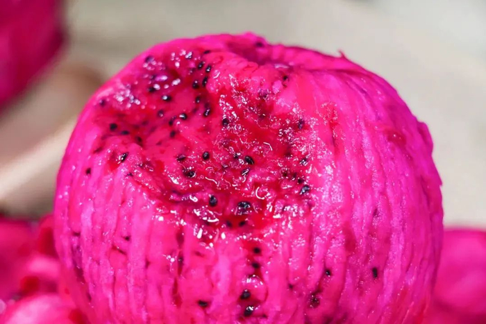 外表朴实、内在丰富!玫红色的外皮下,包裹着紫红色的果肉和一颗颗芝麻大小的种子,充沛的汁水被牢牢地锁在果肉里。