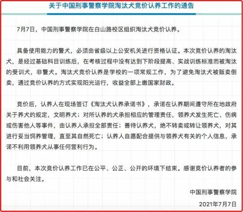 7日下午,中国刑事警察学院公众号发布《关于中国刑事警察学院淘汰犬竞价认养工作的通告》,通告显示“收益全部上缴国家财政”。