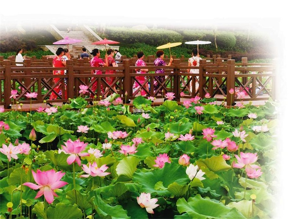 荷花一般每年5月中旬进入花开期,花期将持续到8月份。南湖公园以“曲桥荷韵”为主题,结合生态岛景观,在九曲桥区域种植面积约2200平方米的荷花、睡莲等水生花卉。盛开的花儿在九曲桥的掩映之下,宛如仙境一般,美不胜收,令人心旷神怡。