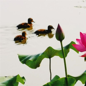 走在荷花田间,惬意地闻着荷花的清香,纯白的、粉红的荷花开得错落有致,与天相映,与山相衬,构成一幅淡雅清新的画卷。