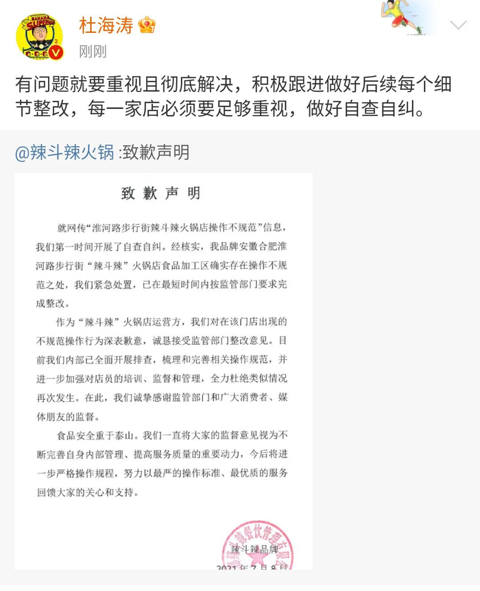 8日下午,辣斗辣官方微博发布道歉声明,杜海涛转发该微博,并称“有问题就要重视且彻底解决,积极跟进做好后续每个细节整改,每一家店必须要足够重视,做好自查自纠。”