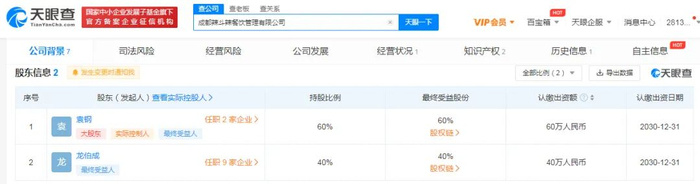 据“辣斗辣”官网,该品牌运营主体为成都辣斗辣餐饮管理有限公司(下称成都辣斗辣餐饮)。天眼查App显示,成都辣斗辣餐饮成立于2019年4月,注册资本100万元,法定代表人为龙伯成,经营范围含餐饮企业管理;食品生产技术研究等,由袁钢和龙伯成分别持股60%、40%。在股东信息一栏,并未出现杜海涛、吴昕的名字。