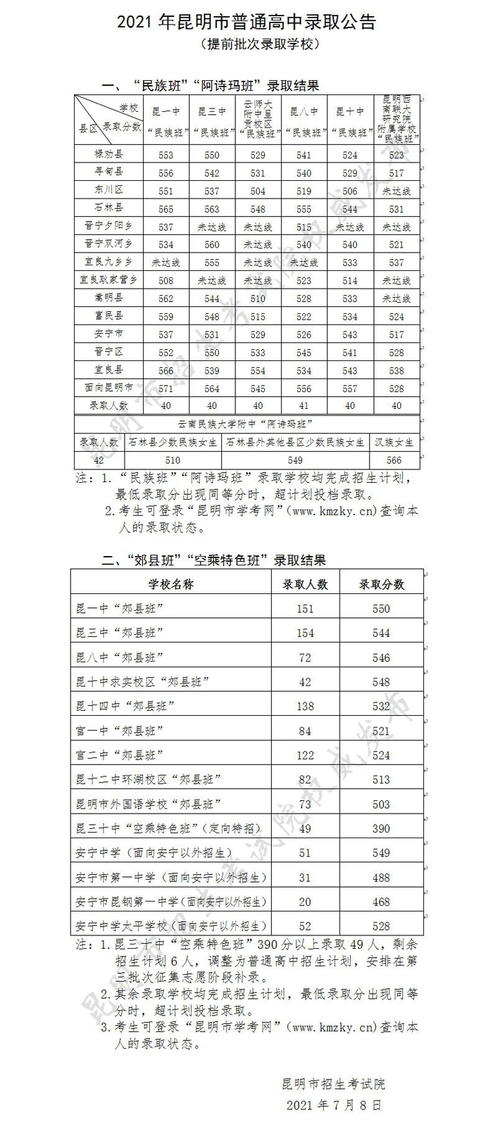 昆明市招生考试院发布录取公告,公布了提前批次录取学校“民族班”“阿诗玛班”以及“郊县班”“空乘特色班”录取结果,同时公布了主城区第一批次招生录取学校第一阶段估分填报志愿录取结果和第二阶段征集志愿指标,以及定向择优生录取分数。昆明市2021年普通高中招生录取工作,从7月8日开始,到7月25日全部结束。