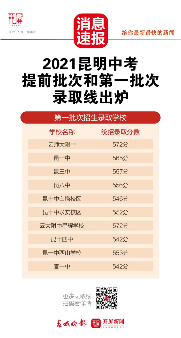 原标题:最高572分!刚刚,2021昆明中考提前批次和第一批次录取线出炉