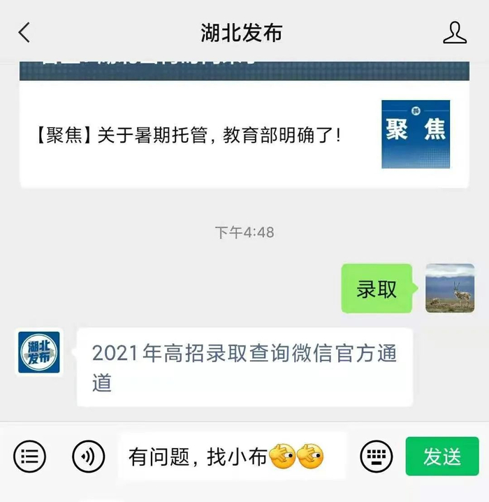 二、在对话框输入“录取”、“高考录取”、“录取查询”、任一关键词,点击回复蓝字,即可进入网页版或手机版查询通道。