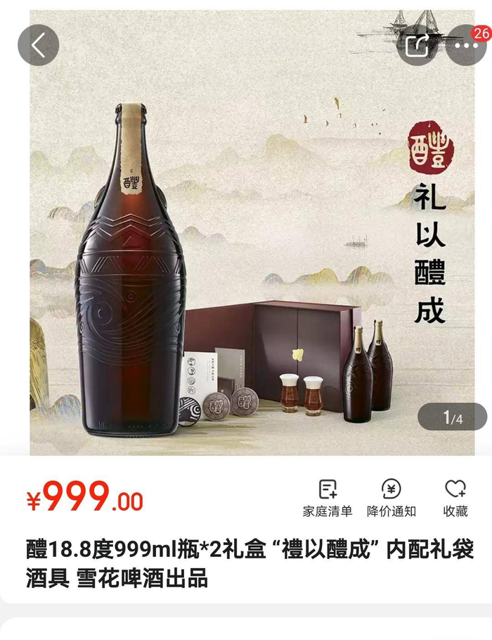 雪花啤酒一直走“平价”路线,以销量第一的雪花啤酒冰酷9度330毫升为例,24听整箱优惠后售价48元,即每罐单价仅2元。“醴”的定价突破了人们对啤酒产品高端与超高端价格带的理解。