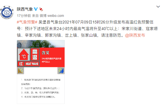 吴堡县气象台2021年07月09日15时26分升级发布高温红色预警信号:预计下述地区未来24小时内最高气温将升至40℃以上:宋家川街道、寇家塬镇、辛家沟镇、郭家沟镇、岔上镇、张家山镇,请注意防范。