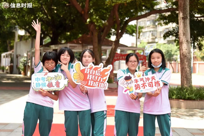 日前,广州白云广雅实验学校举行了2021届中考祝福活动。老师们身穿红色短袖,挥舞着小旗帜,给学生加油打气。