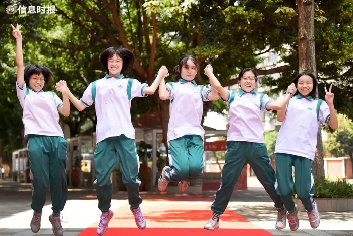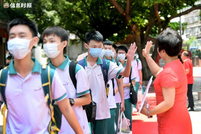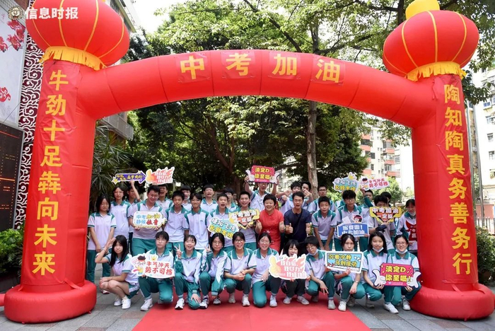 7月9日上午,广州市晓园中学举行了2021中考壮行礼。初三年级教职工和行政人员统一穿红色短袖,在一楼校道列队为初三学生壮行。走过红地毯,学生们依次接受老师们的壮行祝福。