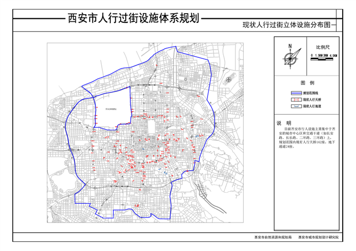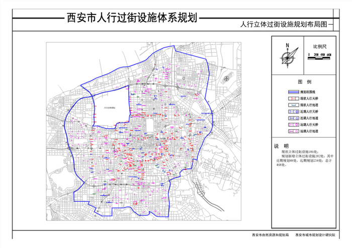 2020年8月21日,西安市自然资源和规划局发布了《西安市人行过街设施体系规划》,以大数据下的西安市步行交通需求预测模型校核,对满足设置立体过街设施的地点进行了布局,按需统筹。