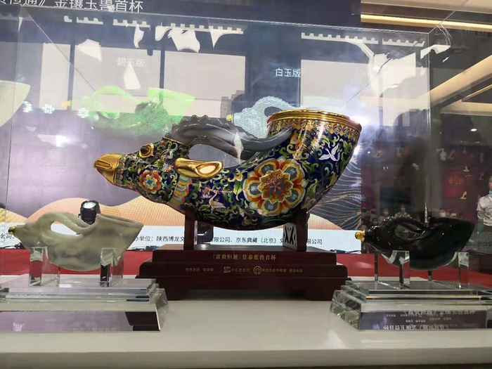 我们博物馆的兽首玛瑙杯只有10多公分,现在开发出来的景泰蓝兽首杯有50多公分,材质也发生了一些变化,玉系列的和原来国宝的大小基本相同。