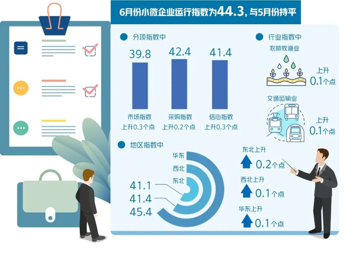 具体来看,6月份农林牧渔小微企业运行指数为43.4,上升0.1个点;制造业小微企业运行指数为45.2,与上月持平;建筑业小微企业运行指数为40.7,与上月持平;交通运输业小微企业运行指数为43.1,上升0.1个点;批发零售业小微企业运行指数为45.5,与上月持平;住宿餐饮业小微企业运行指数为40.1,与上月持平;服务业小微企业运行指数为41.3,与上月持平。