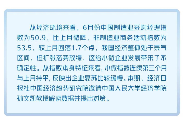 6月份反映小微企业经营预期情况的扩张指数较上月下降0.2个点;信心指数较上月上升0.3个点。