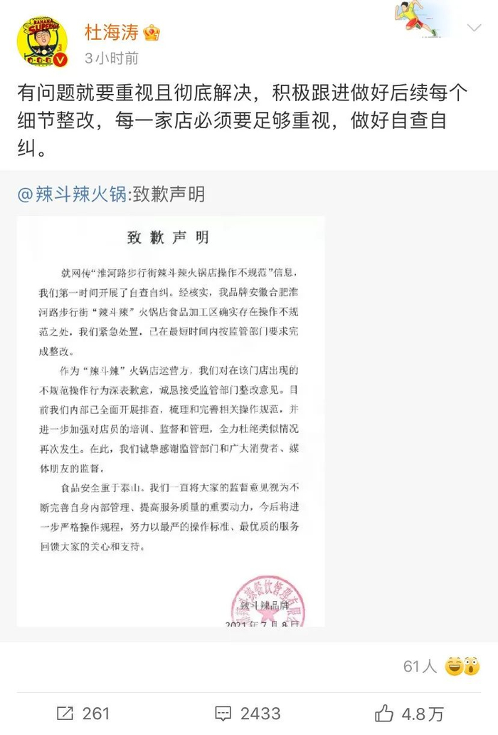 随后,湖南卫视主持人杜海涛转发前述《致歉声明》称,有问题就要重视且彻底解决,积极跟进做好后续每个细节整改,每一家店必须要足够重视,做好自查自纠。