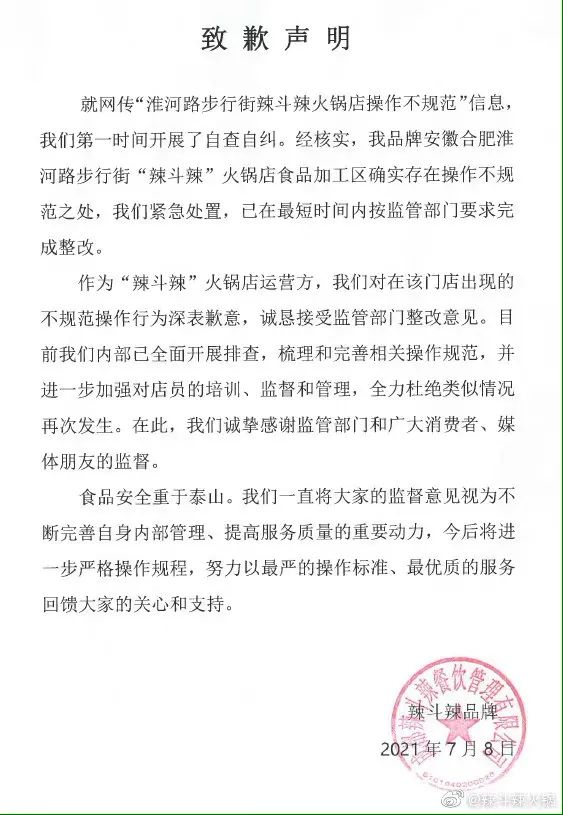 “辣斗辣”发布的《致歉声明》称,就网传“淮河路步行街辣斗辣火锅店操作不规范”信息,辣斗辣第一时间开展了自查自纠。经核实,合肥淮河路步行街“辣斗辣”火锅店食品加工区确实存在操作不规范之处,公司紧急处置,已在最短时间内按监管部门要求完成整改。