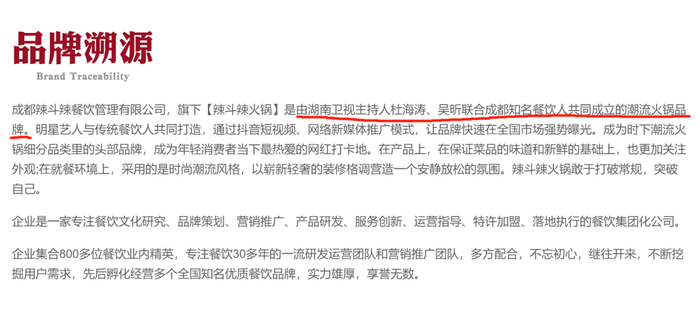 据辣斗辣火锅官网信息,辣斗辣火锅创立于2018年,是由湖南卫视主持人杜海涛、吴昕联合成都知名餐饮人共同成立的潮流火锅品牌。