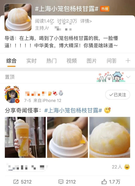 7月5日,7分甜豫园店推出限定版新品#上海小笼包杨枝甘露#,由于产品十分具有话题性,在微博上得到了引爆,当天直接冲到了微博热搜第8名,阅读量超过1.4亿。