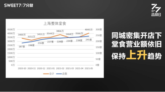 7分甜通过在上海的热门商圈拿A类点位,向消费者传递高品质的品牌价值。并且,在核心区域的重点点位,全部采用直营的模式。目前上海地区的直营门店超过100家,上海地区的门店总数已突破260家。更难得的是,即使是在上海的密集开店下,7分甜的堂食营业额依旧保持上升趋势。