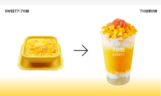 在2018年上半年,7分甜的转型升级过程中,品牌定位经过细致梳理后,将定位由原来的可以喝的甜品,改为芒果饮品,也就是7分甜2.0版本。
