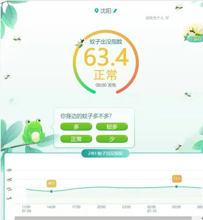 大数据显示,7月9日8时,沈阳蚊子出没指数为63.4,暂时属于正常范围,在11时达到一个小高峰后,蚊子的出没指数呈下降趋势。当天14时是沈阳蚊子最不活跃的时间,蚊子出没指数为60.1。而从当晚20时开始,至次日的5时,是蚊子最活跃的时间段。中国天气网预测,7月10日早5时,沈阳的蚊子出没指数将达到峰值73.5,沈城居民可以采取夜间防蚊措施,别让蚊子扰了你的清梦。