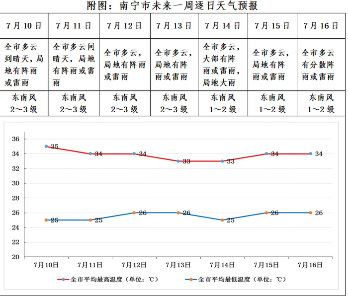 未来一周(7月10日—16日),受副热带高压控制,以多云有阵雨天气为主,中东部地区及左右江河谷有4~6天35~37℃的高温天气。