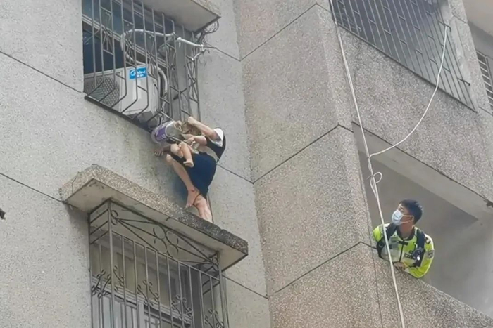 7月5日早上,东莞市虎门镇一名3岁男孩爬上自家的窗台,不慎头被卡于阳台防盗网上,两脚悬空。孩子母亲从楼梯口跳到窗户下边的水泥平台,托住男童等待救援。接到报警后,东莞市消防救援支队马上调派12名消防员赶赴现场开展救援。消防救援人员到达现场后发现,男童母亲在狭窄的水泥平台上,没有任何安全保护,极易发生坠落,情况十分紧急。