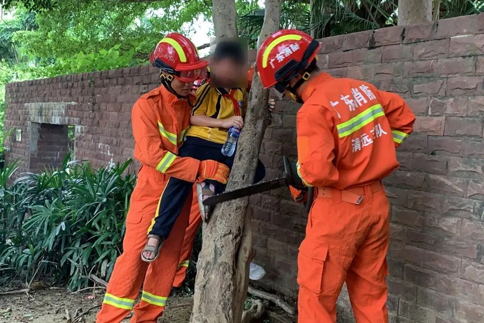 7月1日晚6时许,清远市清新区体育馆附近,有一名小男孩腿部被卡在树杈,急需救援。接到报警后,太和消防救援站立即出动1辆消防车赶赴现场处置。