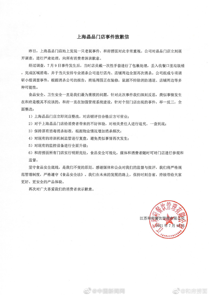 针对上海晶品广场店出现死老鼠事件,和府捞面10日发布致歉信称,立刻展开调查,进行严肃处理,向所有消费者深表歉意。对该门店立即闭店整改,对店铺评估合格后方可营业。对相关责任人进行追究,一查到底,避免事件再次发生。此前,据媒体报道,有顾客在座位下面发现一只老鼠尸体,随后,该店员工使用一次性手套将老鼠尸体捡起来,从出餐口丢进后厨。