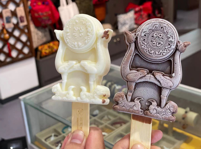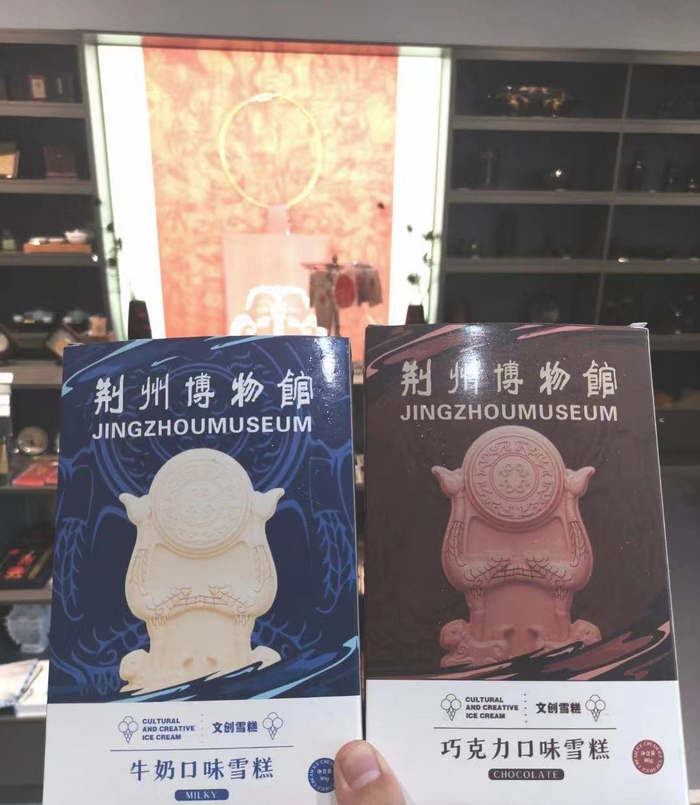 文创雪糕分为巧克力和牛奶两种口味,以荆州博物馆馆藏文物虎座鸟架鼓为原型,造型精致、逼真。荆州的魅力,不止留在眼里、胃里,也甜甜地融化进了心里!