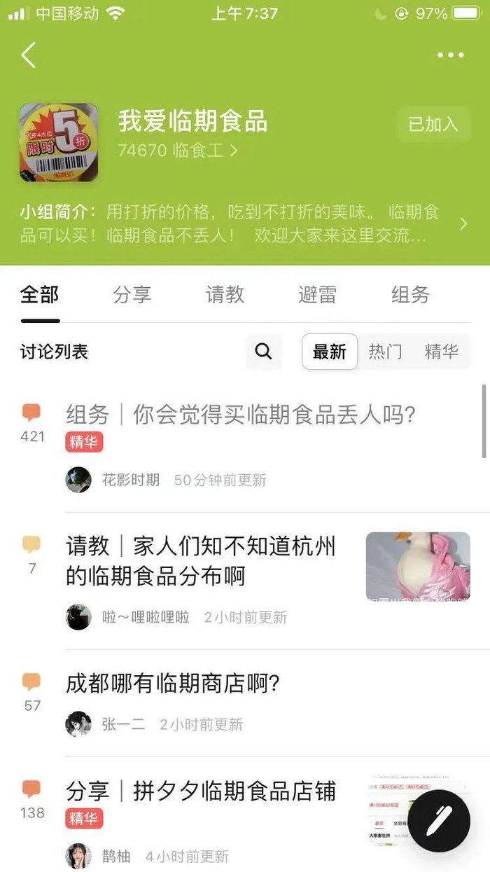 在这里,年轻人聚在一起,分享各种渠道搜集到的临期食品信息,他们践行着自己的“小众”生活方式,并乐于把这样的消费观传递给更多人。