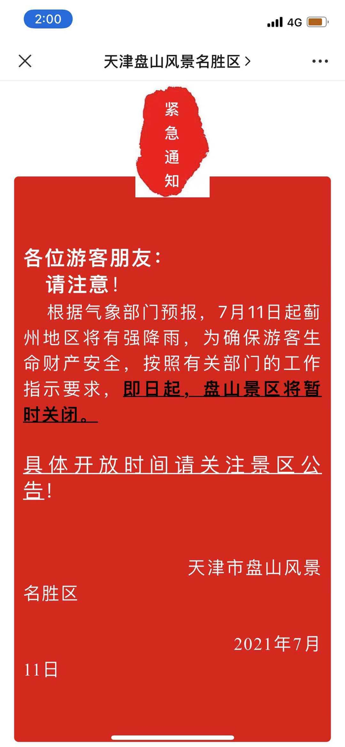 受强降雨影响,今天天津蓟州区山区所有景区、景点、农家院都已经全部关闭。盘山风景名胜区、梨木台景区均发布紧急通知,即日起盘山景区将暂时关闭,具体开放时间需关注景区公告。