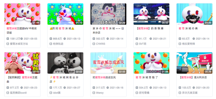 2021年6月,“蜜雪冰城”在B站上发布的主题曲横扫了社交网络,仅靠“你爱我,我爱你,蜜雪冰城甜蜜蜜。”和“I love you, you love me。 Mixue ice-cream and tea。”两句歌词,就在社交媒体上获得了爆炸式的营销效果。
