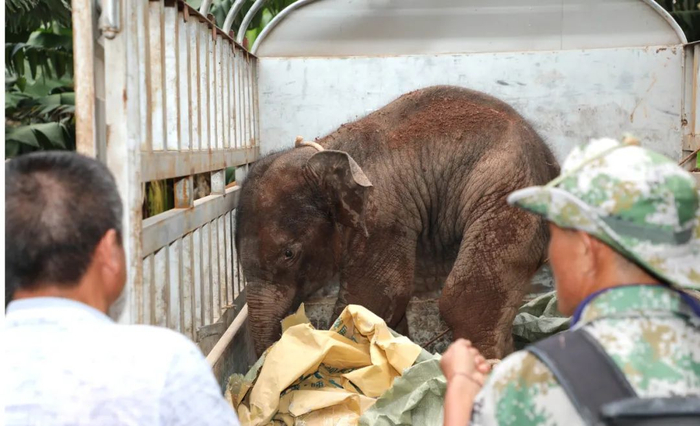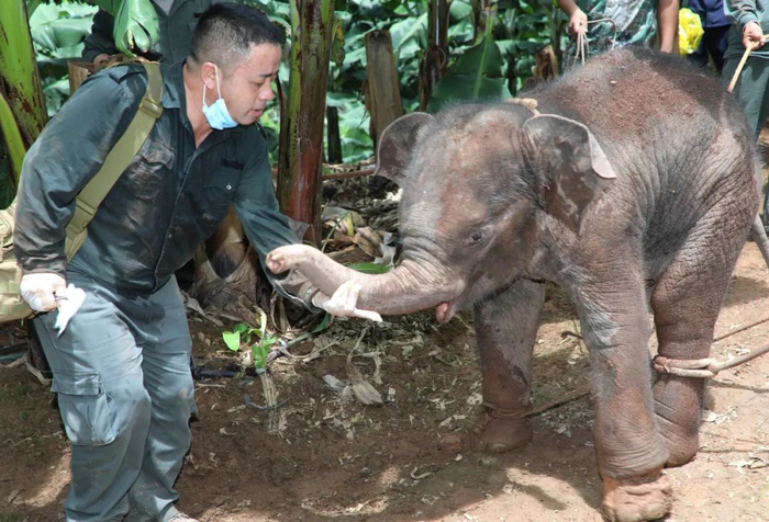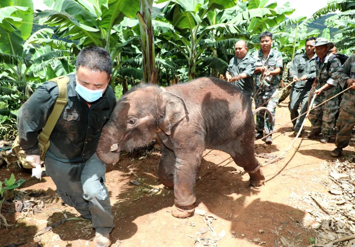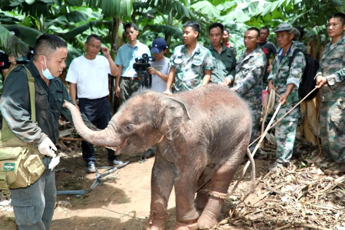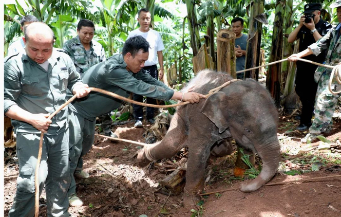 中午11点40分许,跟踪观察的护林员发现这头小象进入了一个地势平缓、利于施救,且位置靠近路边的香蕉地里。面对稍纵即逝的救援时机,6名营救人员立刻冲过去前后将小象围住,并采取用绳索捆绑四肢的方式将其控制。医务人员随即使用消毒药水对受伤的左前腿部位进行了清创和消炎处理。随后将小象带出香蕉地,采用五个人同时抬起头部和四肢的方式,装上了事先停放在地头的小货车上。