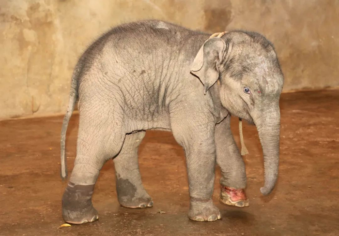 “小象身高110厘米、体重180公斤,年龄应该在2个月左右。”西双版纳亚洲象救助中心的“大象医生”保明伟介绍说,经专家组初步调查分析,小象腿部的伤应该是在森林中活动时,遭到长满锯齿般锋利勾刺的藤篾缠绕挣扎所致。目前小象精神状态良好,大约通过1个月时间的治疗,应该就能基本痊愈。