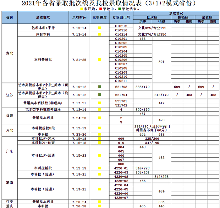(一)湖北美术学院高考文化分投档分数线执行2021年湖北省相应批次与相应类型的录取控制分数线: