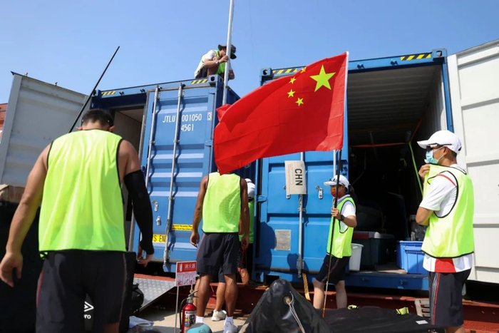 7月11日,中国帆船帆板队成员在比赛地熟悉环境并整理物资