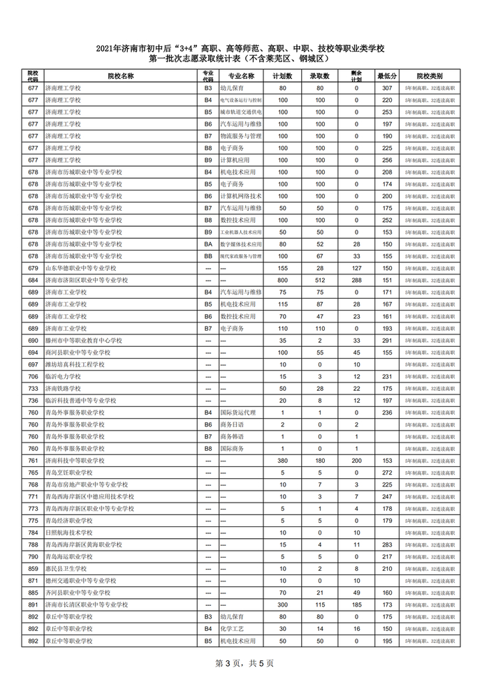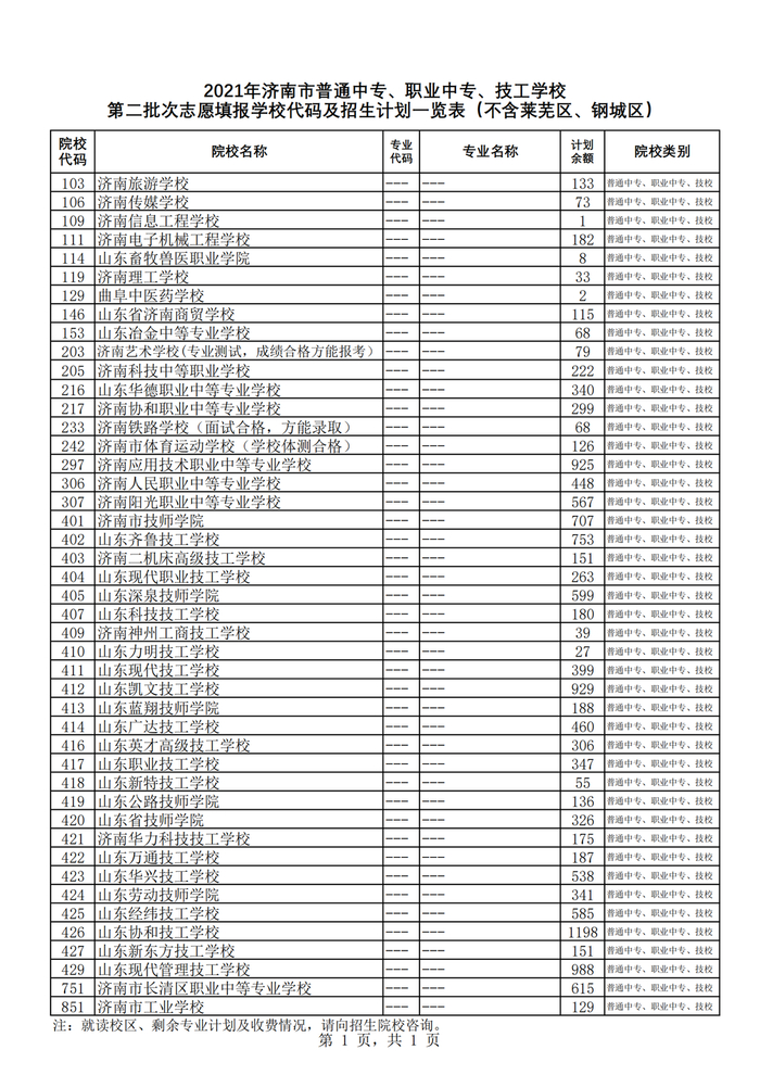 市属及面向市区招生的普通高中学校统招计划、学校代码、各职业教育类学校剩余招生计划,可查询“济南市教育招生考试院”网站(http://www.jnzk.net/)。面向本区县招生的普通高中学校剩余招生计划,请咨询有关区县教体局(电话:长清区87224615,济阳区84235007,商河县84874045)。
