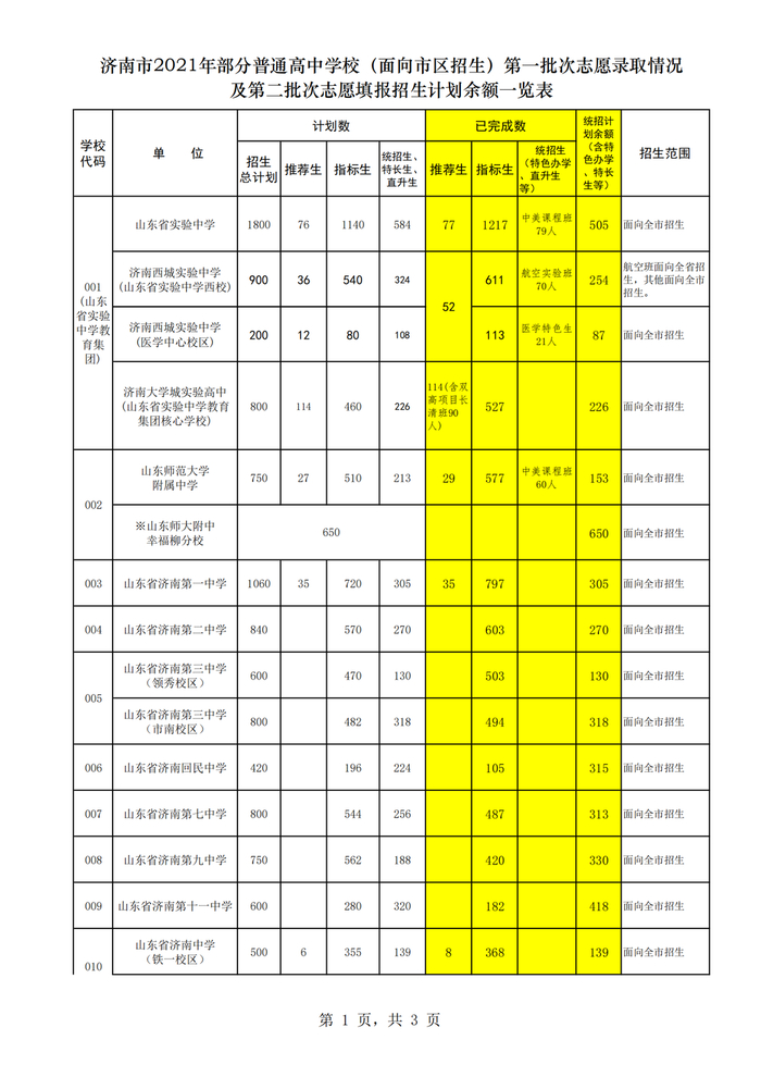 原济南地区:高中阶段学校招录第二批次志愿填报说明、各校剩余招生计划