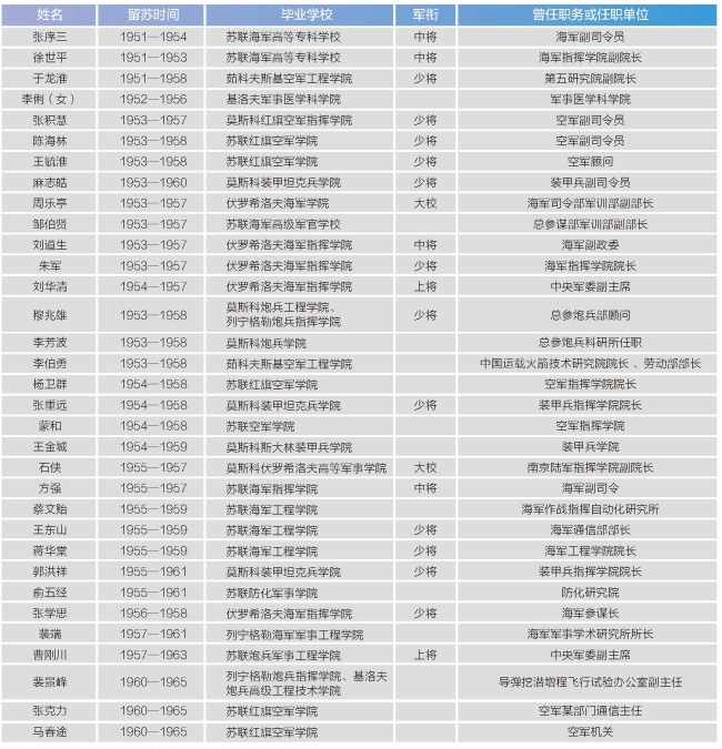 第四是在国防军事领域出类拔萃。从1951年到1965年,中国向苏联派出了800名军事留学生。回国以后,他们一部分人转入国防科技工业部门或地方参加建设,一部分人继续留在军队,有的从事军事教育工作。其中不少人后来成为将军,甚至是中央军委领导,如刘华清和曹刚川都曾担任中央军委副主席,他们在军队建设、军事教育以及国防科技等领域建功立业,成绩斐然。
